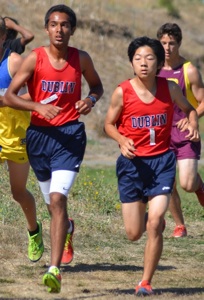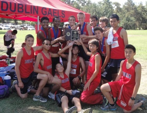 October 19, 2012 - Monterey Bay Invitational - Toro County Park, Salinas - Proving that their North Coast Section Division 2 ranking was no fluke, the Dublin Gaels Cross Country Team traveled to the Central Coast Section championship course and showed they could hold their own against anyone. Junior Thomas Lee got the day started out in winning fashion, winning the Mens Junior Varsity Race with a time of 18:21 over the 3 mile course. But that was just the beginning for this team - seniors Lam Dang (13th - 19:04), John Henry (15th - 19:07) and Mitch Kless (8th - 18:49), and junior Balkirat Sahota (6th - 18:40) all also medaled and were solid contributors to their winning the race by more than a commanding 30 points! Seniors Ryan Durflinger (19:48) and Feroez Chinkonsung (19:53) rounded out the victorious team. But they weren’t the only team making the medal stand - the Frosh/Soph Boys Team, running without their top four who were up on varsity, still managed to pull out a 2nd place showing. They were lead by medalists sophomore Goutham Marimuthu (4th - 17:51) and freshmen Rei Echizenya (28th - 19:06), Grant Lemen (26th - 19:00), Daniel Sweeney (12th - 18:28) and Davis Zamboanga (9th - 18:15). Also contributing on the scoring seven were freshmen Quinn Heinbaugh (19:26) and Marcel Henry (20:30). The Mens Varsity Team just missed the medal stand in fourth place, but still had senior Kenneth Ainslie (17:15), junior Garrett Garcia (25th - 17:18) and sophomore Zachary Schmidt (13th - 16:59) medal. Rounding out the hardware for the Gaels was freshman phenom Gabrielle Gamboa, who took 7th in the Womens Varsity Race with a fine time of 20:02. Dublin Monterey Bay Results Complete Monterey Bay Results William Hearne Monterey Bay Photos